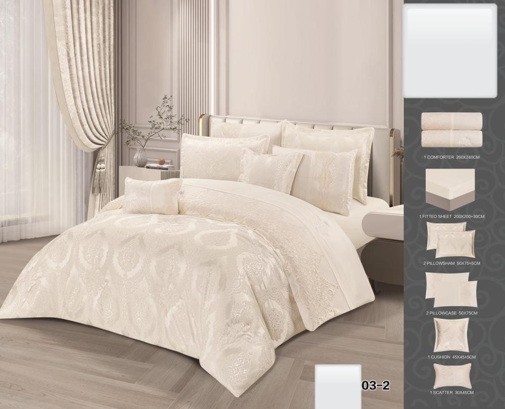 يتميز هذا الطقم الملكي من مفارش سرير عرسان بثمانِ قطعٍ فاخرة، مصنوعة من دانتيل الجاكار والقطن. يشمل لحافًا بحجم 240×260 سم وشرشفًا مطاطيًا 200×200 سم، إضافة إلى أربع مخدات كبيرة وتكايتين. التصميم المستوحى من الطراز الملكي يجمع بين الأناقة والراحة، مع نقوش دقيقة وألوان هادئة كالبيج الفاتح. يوفر هذا الطقم تجربة نوم استثنائية للعروسين.