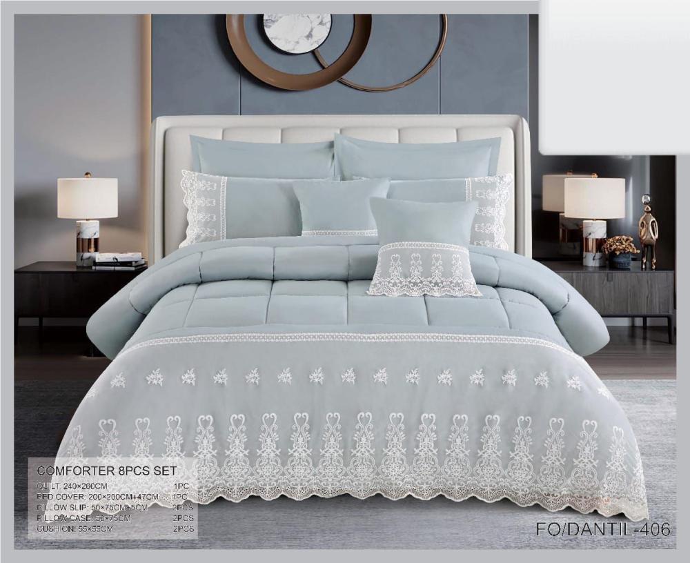 تتميز مجموعة المفارش الصيفية للعرائس بثمانية قطع متناسقة، مصممة لتوفير الراحة والأناقة في آن واحد. تشمل المجموعة لحافًا كبيرًا وشرشفًا مبطنًا، إضافة إلى أكياس وسائد متنوعة الأحجام. الخامات عالية الجودة والمبطنة تضمن ملمسًا ناعمًا ومريحًا، مما يجعلها مناسبة تمامًا لأشهر الصيف.